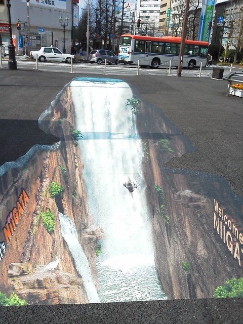 今日の午後、新潟駅の万代口のバスターミナル付近の連絡通路の階段を下りてましたら、広場(という場所なのかよくわからないけど、車が入れないところ)が陥没してるのが見えました(笑)