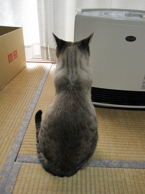 私に抱っこされまくり、匂いかがれまくりの刑にあったので、ヒーターの前でしっぽバンバンしながら怒ってます。