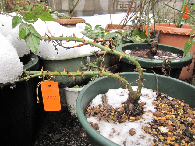 暗くてわかりにくいとは思いますが、こちらも雪が曲げてくれたバラの枝。