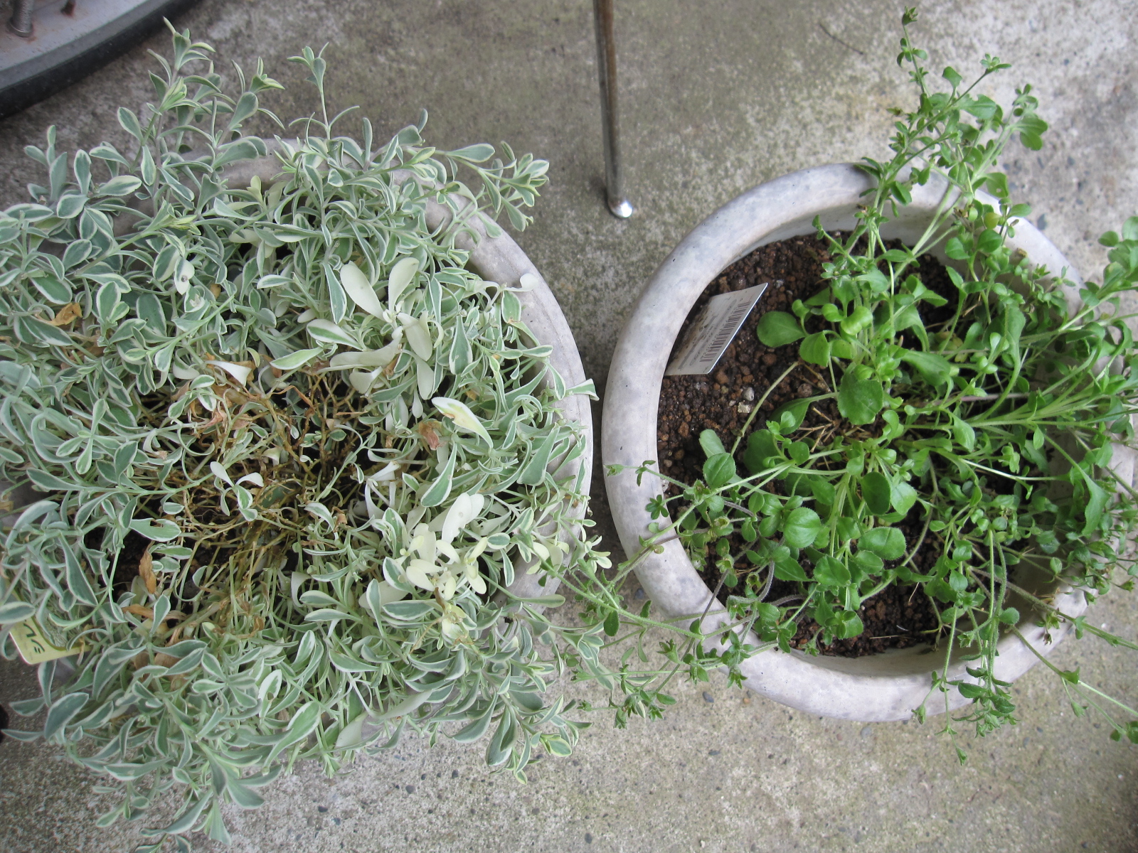 8号鉢にメリテスとシレネとカーペットカスミソウが寄せ植えしてあったのですが、ぎゅうぎゅうになって共倒れしそうな気配だったので全部別の鉢に分けました。