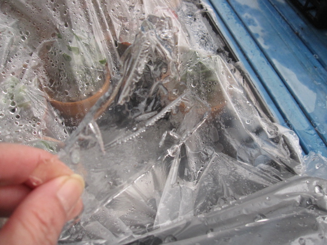 ベランダのビニール袋でくるんだ多肉たちは無事のよう(に見える。)